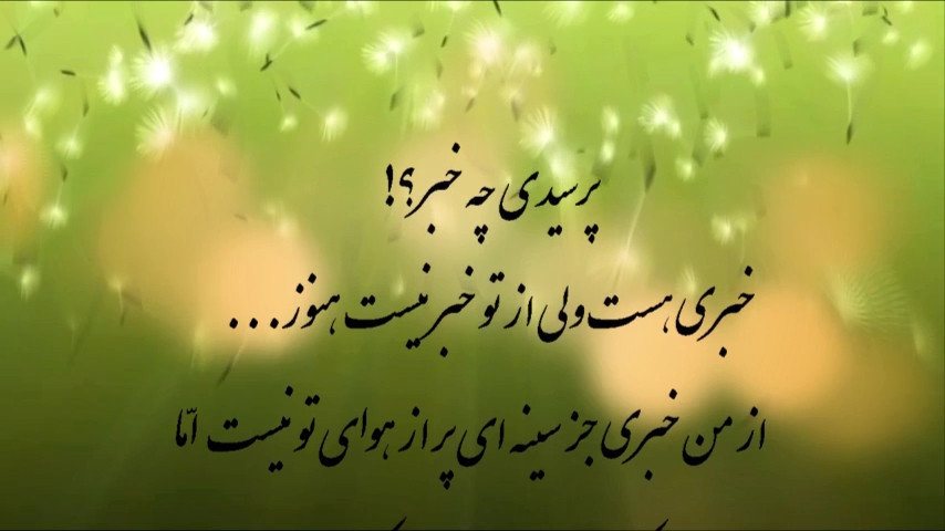 پرسیدی چه خبر؟! خبری هست ولی از تو خبر نیست هنوز... از من خبری جز سینه ای پر از هوای تو نیست امّا خبر آن است که آرزویی را برآورده کند و جانی را مصفّا خبر آن است که دلی را سروسامان بدهد خبر آن است که خبر های جهان را به کناری بزند جانا خبر آن است که حدیث تو را بگوید، تو را بجوید و برای تو بخواهد خبر آن است که از خانه ی تو پرواز کند و بر خاطر من نشیند خبر آن است که مژده ی تو را بدهد و عطر نفس های تو را خبر ها در میان دست های تو و در تلاطم چشم های تو ست خبر آن است که تو بگویی و من بشنوم خبری هست ولی از تو خبر نیست هنوز...